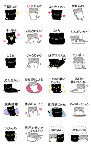 お疲れ気味やる気が出ない時に使える広島弁のゆるかわサバトラ白猫と黒猫のスタンプ 仕事 進捗 気づかい 春夏秋冬 体調不良 山口 鳥取 島根 岡山でも