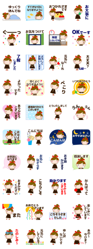 かわいいお団子ヘアの女の子。優しい気持ちがつまった日常会話に使いやすいゆるいスタンプ。敬語も。字が見やすくシンプル。おつかれさま、よろしく、ありがとう等