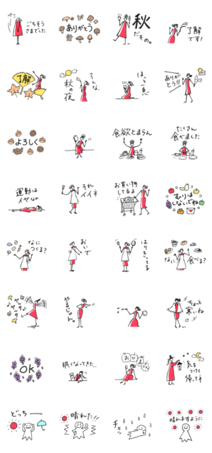 秋の季節。大人も女の子も使えるカワイイけど可愛すぎないシンプルタイプ。食欲、運動、芸術、お月見、ごちそうさま、お買い物、料理にまつわる言葉もセット。敬語もあり。