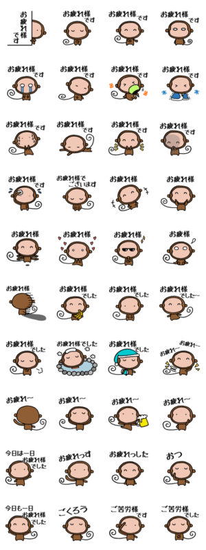 おさるさんのスタンプ第9弾。よく使うであろうお疲れ様。いろいろなシチュエーションで使えます。さらっと、悲しげ、泣きながら、感激、喜び、冷ややかに…。サル。monkey
