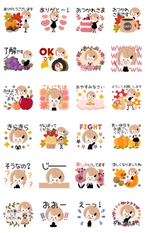 秋と女の子をテーマにしたスタンプ。全体的にクオリティが高く、カジュアル・フォーマル共に使える仕上がり。汎用性も高く優秀。