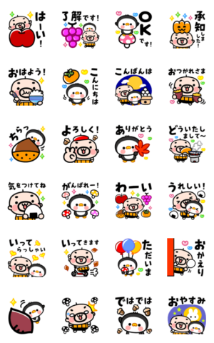 おやじ君とかわいいペンギンちゃんの楽しい秋スタンプ!秋の食べ物いっぱいの飛び出すスタンプです♪毎日使える挨拶や返事がそろってますよー。