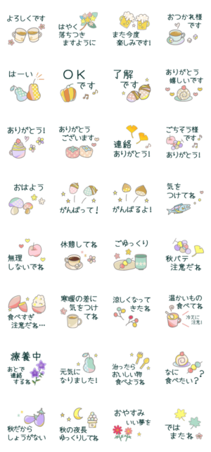 朝と晩で暑いと寒いが激しくなる季節に送りやすい便利な言葉が多いです。食欲の秋で食べすぎ注意や療養中あとで連絡するねなど体を壊しがちな9月と10月に優しいスタンプ