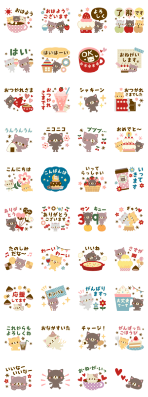 かわいいお菓子や食べ物と、ナチュラル&カントリーテイストなネコたちのスタンプです♪【黒猫、トラ、ミケ猫、敬語、大人かわいい】さもはん より発売