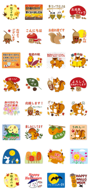 絵本の様な秋のスタンプです。秋ですね/落ち葉/紅葉/敬老の日/ハロウィン/月見/焼き芋/コオロギ/食欲の秋/読書の秋/どんぐり/ミノムシ/赤とんぼkayochi より発売