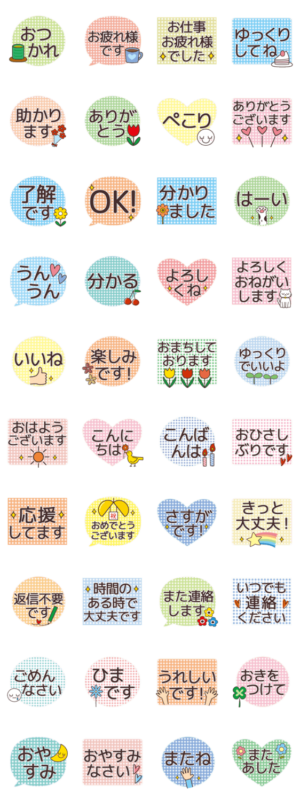 非常にシンプルで使いやすい、汎用性あるメッセージ群のスタンプ。特に変な誤解を招きたくない仕事やフォーマルシーンで非常に重宝するだろう。