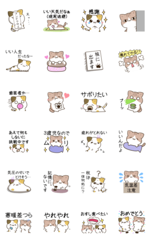 お疲れ気味 やる気が出ない時に使えるゆるかわ三毛猫とキジトラ白猫のアニメーションスタンプ第6弾 仕事 締め切り 進捗 社畜 食べ物 体調不良 春夏秋冬 でか文字 寿司 気圧つきしろ より発売