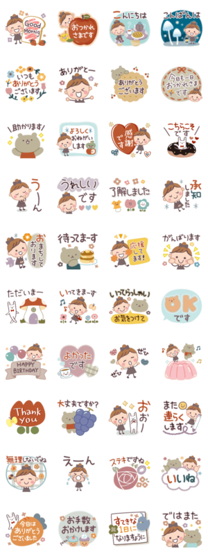 毎日使える可愛い女の子のスタンプ第4弾。日常に使えるスタンプです。くすみカラー/北欧/ガーリー/ほのぼの/キュート/デカ文字/お団子/シンプル/敬語/ママ友/スイーツ