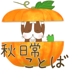 日常的に使えるデカ文字スタンプです。仲良しの犬、猫、うさぎがお茶目で可愛いイラストです。時々登場するカエルや青い鳥もポイントです。秋/友達/ハロウィン/台風
