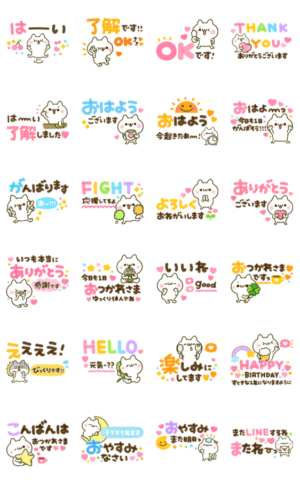 大人可愛いカラフルな文字の表情豊かな顔文字にゃんこ♡ かわいい日常がいっぱい詰まったリアクションいっぱいのちょこんと省スペーススタンプです♪ぴよたぬき より発売