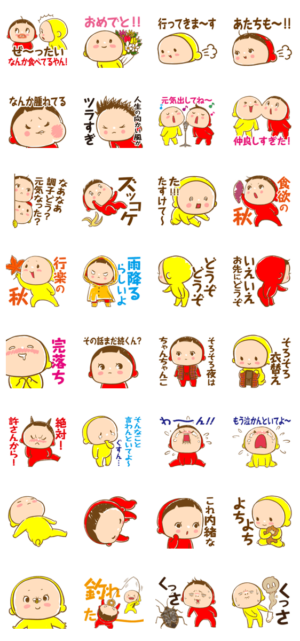 全身タイツのキャラクターがメインのスタンプ。赤ちゃん(体型)キャラが好きな人にはいいかも?秋向けのスタンプがいくつかある。
