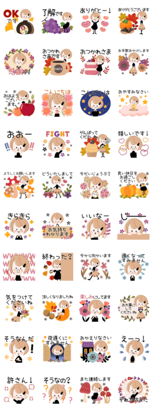 毎日使える可愛い秋色のガーリースタンプです。 あいさつ/おはよう/おつかれさま/よろしく/ありがとうNAKAYUKA より発売