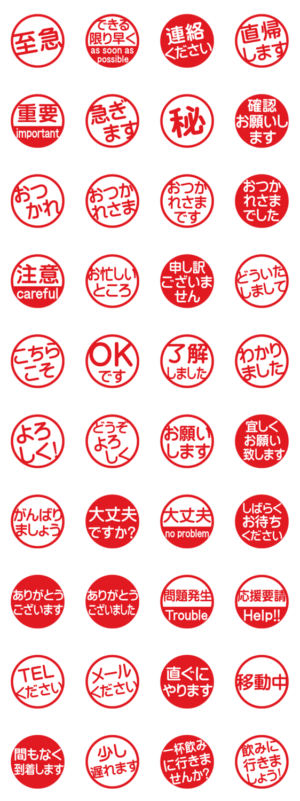 仕事/業務でよく使う言葉を厳選!大きな文字(でか文字)で見やすく読みやすいハンコ風スタンプ!先輩/後輩/上司/部下等業務連絡にお勧め!一つあれば便利な定番セットです。