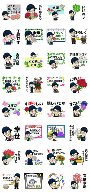 花屋さんで働く男性店員のラインスタンプ第二弾。お花や植物が好きなガーデニング男子にもおススメ。普段よく使う言葉や挨拶が敬語中心でたくさん。接客にも便利。デカ文字dokukinoko より発売