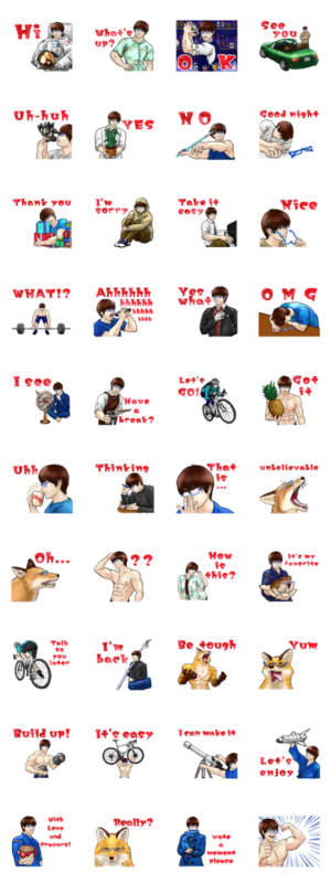 狐の化身、ブルーのメガネのイケメンマッチョ成井武乃進がスタンプに!コーヒーに宇宙に筋トレに…「成井の日常」が詰め込まれた使いやすいスタンプの英語版!!