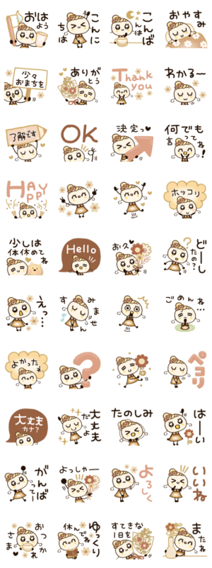 ほぺ美ちゃんシリーズ♡ブラウンを基調とした、大人っぽくてキュートなスタンプです♡毎日使える/小さな幸せ/感謝あさごぱん より発売