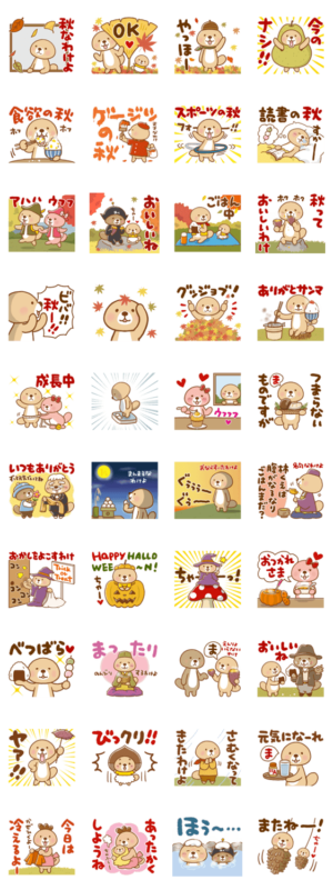 ラッコさんの全力で秋を楽しむ様子が微笑ましいスタンプです。秋を満喫したいですね。