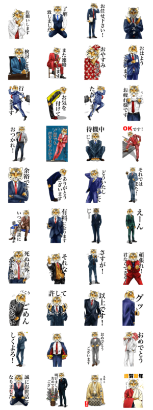 ダンディにスーツを着こなすDANDY虎男(ダンディトラオ)のスタンプです。よく使う日常会話から、年末年始の挨拶まで。男性は勿論、虎が好きな女性にもオススメです♡ ※このスタンプはトークルームで大きく表示されるBIGスタンプです。ともちん より発売