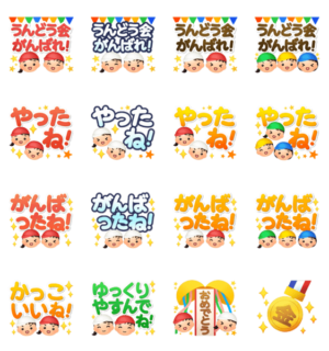 お孫さん、息子さん、娘さんの運動会の応援に使えるスタンプです。お祝い/がんばれ/おめでとう/おつかれさま/金メダル/赤組/紅組/白組/青組/緑組/青組/黄色組/黄組