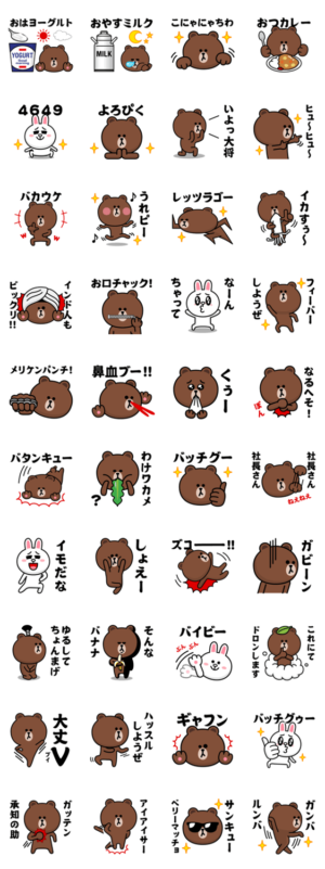 LINEキャラクターズのブラウンとコニーが登場。毎日使える、便利で日常会話の挨拶スタンプ。昭和レトロやダジャレ、オヤジギャグ、死語などをテーマにしたスタンプ。 ※BROWN & FRIENDS をみんなでつくろう!キャンペーン参加スタンプです4A-Studio(よんえーすたじお) より発売