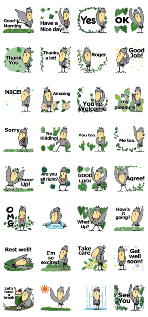 ハシビロコウとサボテンなど緑の植物の毎日便利な優しいスタンプ英語版です♪トマト より発売
