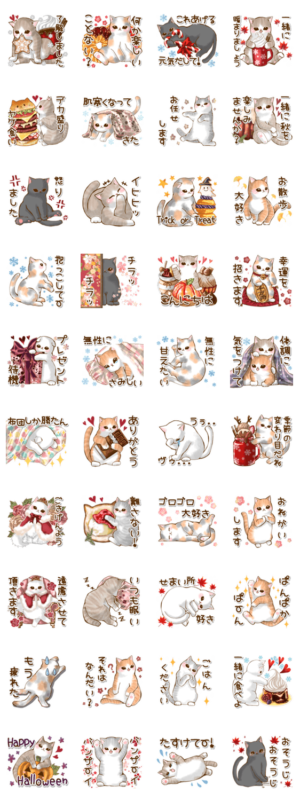 秋から冬まで幅広く使えるスタンプです。 猫/ねこ/ネコ/秋/スイーツ/冬/日常会話/普段使い 思いやり/気づかい/毎日使い茶々 より発売