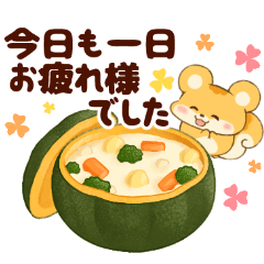 秋の味覚に囲まれながらのリス君が最高に可愛らしいですね。とってもほのぼのするスタンプです。