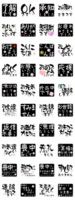 落ち着いたシンプルでデカ文字のスタンプです。喪中の時や喪中の方に送る時などに使って下さい。喪中ではない人も誰でも使えるように日常によく使う言葉を集めています。