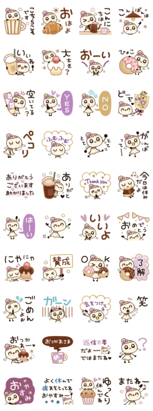 ほぺ美ちゃんシリーズ♡カフェ感のある絵柄多めの、ほのぼの優しいスタンプです。毎日使える/小さな幸せ/感謝あさごぱん より発売