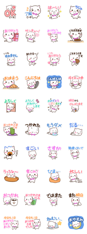 『シロネコすたんぷ』の『絵文字』と『着せかえ』もあります。よく使う言葉や、あいさつの、便利な白猫スタンプ。しろねこ好きな方にぜひ。【かたこ】かたこ より発売