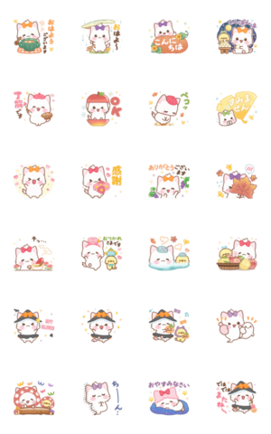 元気で可愛い子ねこ・プチモニカの『秋のみのりとハロウィン』をテーマにしたスタンプです。 お友達のカナリアちゃんと一緒!
