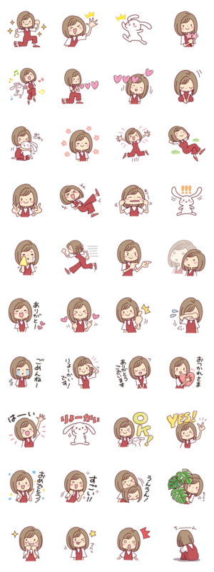 ショートボブの娘の[LINEスタンプの日]特集スタンプ。相棒うさぎのぬいぐるみも登場♪リアクション多め、フレンドリーに使えるスタンプセットです。