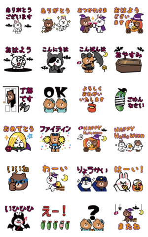 ハロウィンの仮装をしたブラウン、コニー、サリー、チョコ、ムーン、ジェシカ、ジェームズ、部長、エドワードたちの日常的に毎日使える飛び出すスタンプです。 ※BROWN & FRIENDS をみんなでつくろう!キャンペーン参加スタンプでするるるん より発売