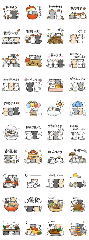 秋バージョンの墨筆ねこスタンプです。 食欲の秋!ラーメン、お寿司!おいしい食べ物と猫に癒されましょう。 トラ猫、黒猫、白猫、茶トラ、サバ、ぶち、三毛猫入り。ユナシ より発売