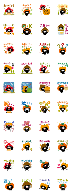 栗、キノコなど秋の食べ物がモチーフのスタンプ。イラストは見やすくまとまっており、メッセージは全体的に汎用性の高いもの。全体として使いやすい作品といえる。