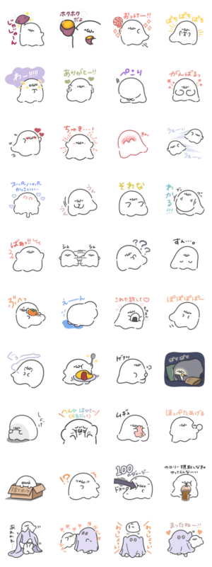 顔文字的なかわいさがあるおばけのスタンプ。ちんまりまとまっているのが良い。汎用性もなかなか。