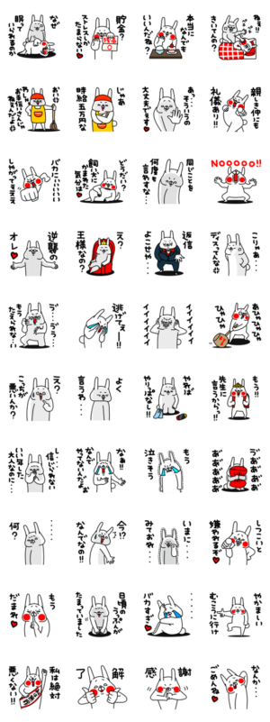 圧の強いうさぎのスタンプ。メッセージも見た目に違わず攻撃力の高いものばかりだが、現代社会において使い道に困ることはない。