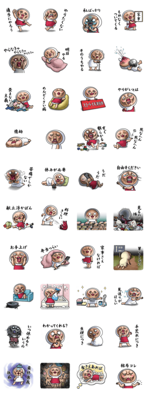 やってることは無気力だが、個性が爆発しているがゆえむしろ印象的なキャラクターのスタンプ。でも家事やってるとこういう気分になる時あるよね……