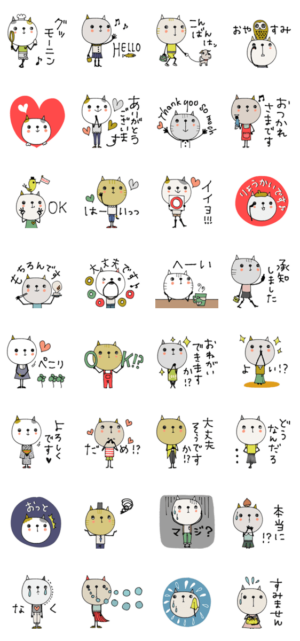 ヨーロッパのマンガ風のデフォルメがなされた猫のスタンプ。派手過ぎずキラキラしすぎず、いろいろな場面に合う。メッセージの汎用性も高い。