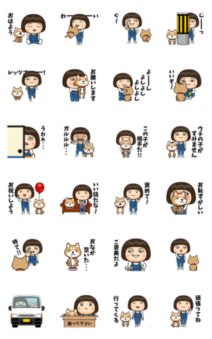 オーバーオールを着た女の子と犬の気遣いあふれるセリフが多いスタンプです。