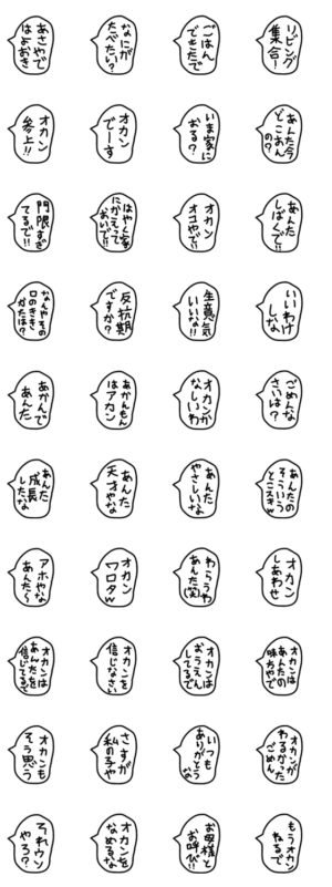 ゆるい手描きのオカンから子供への伝言の吹き出しのスタンプです。手描きのゆるさが反抗期や思春期のお子さんの心をなごませたり、笑顔にする事が、たぶんできます。