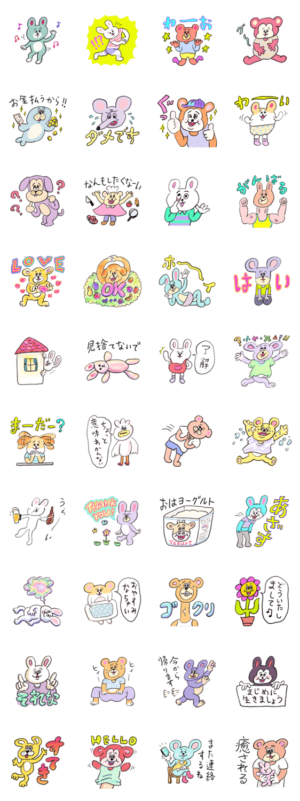 個性的な雰囲気の動物たちのスタンプ。かわいいような、ウザいような何とも言えない絵柄は、刺さる人には刺さるかも。表情やメッセージまでちょっぴり個性的。