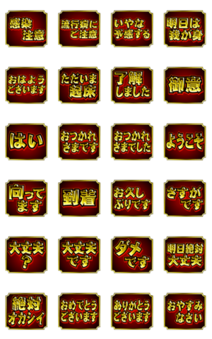 トーク画面の背景から金文字が飛び出る勢いで拡大ループするインパクトのあるデカ文字エフェクトスタンプ第2弾です、おはようからおやすみ、よく使う言葉を中心に送れますハッピーリンク より発売