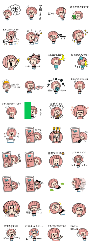 THEポップボブガールのピンク版。日常会話で使える可愛くて気遣い心遣いの言葉が多めのスタンプ。/毎日/ずーっと使える/おんなの子/女子/ピンク/LINEスタンプの日/karin/