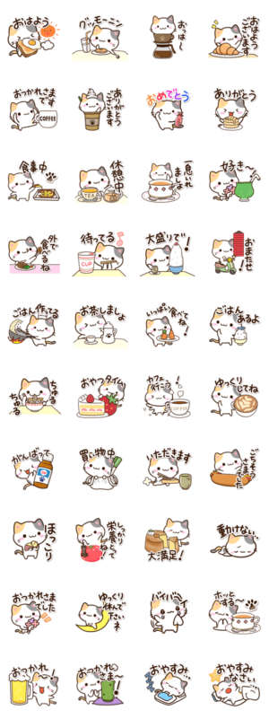 ずっと使える『小さい三毛猫』のスタンプ。よく使う言葉や、あいさつ等、食べ物や飲み物と一緒にかわいく返事ができるミケネコ。みけねこが好きな方にぜひ。【かたこ】かたこ より発売
