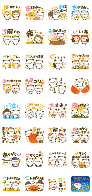 ほっこり秋スタンプ♪ トーク画面を秋らしく彩る♡ころころパンダのスタンプです♪ぴよたぬき より発売