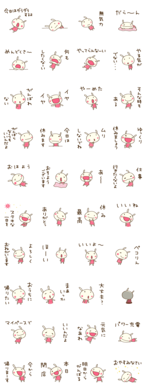 どちウサ。がんばらない編。「めんどくさ〜」「やる気がでない」から「そんな時もある」まで。時には肩の力を抜いて、ゆるい言葉を伝えよう。家族、学校、お仕事でも。Mami / エストループ より発売
