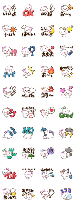 リボンを付けた可愛い『しろりぼん』の【絵文字風】スタンプです。よく使う表情やあいさつ、反応等、使いやすい、かわいいスタンプ。まるくて可愛いキャラです。【かたこ】かたこ より発売