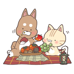 柴犬の「しばきち」と茶トラ猫の「とら」のゆる〜いキャンプスタンプ。秋バージョンです。