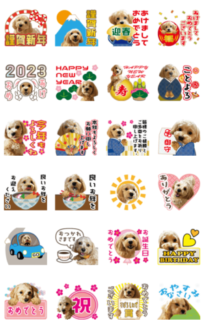 かわいい犬の写真スタンプ。日常/大人が使える/冬/年末年始/お正月/誕生日/お祝い/トイプー/マルプー/トイプードル/いぬ/どうぶつ/ペット/卯/うさぎ2023/寅→兎のアプデ
